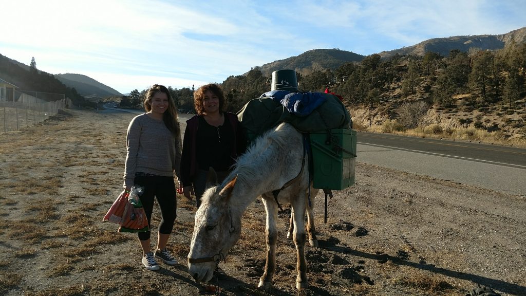 Later on, as we were walking along the railroad tracks headed for Banning, we heard a man’s voice beckoning us to stop. We turned and saw the man, who introduced himself as Jeffrey, walking thru the grass, come over to the fence and ask if he could take our picture. We said sure. He said that he has never seen anything like this before and the sight of us caused him to immediately pull over and want to talk to us. We then had a nice conversation as Jeffrey was curious as to what the Mules were doing and where we were going.