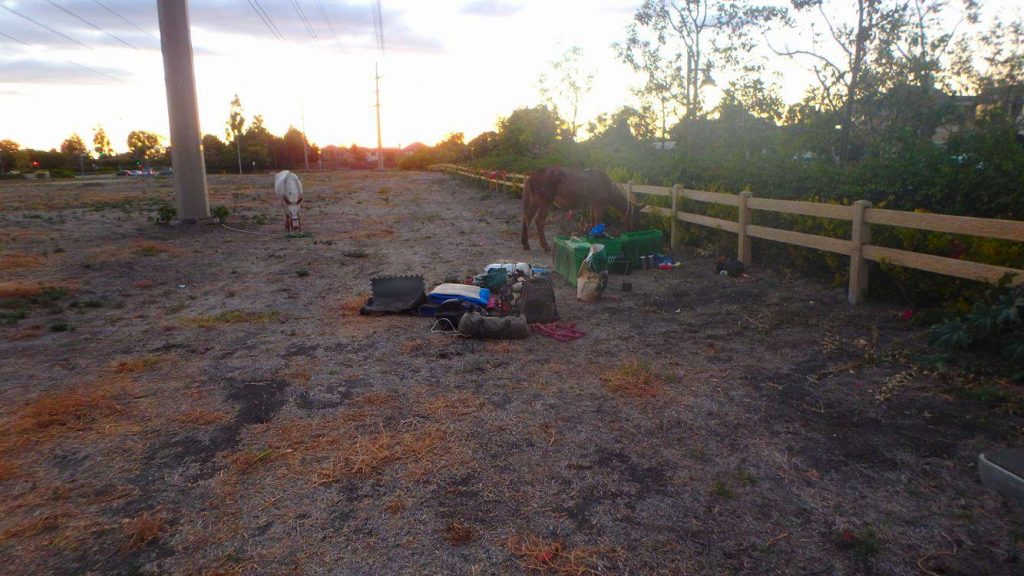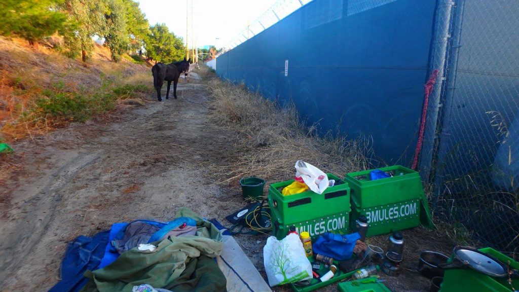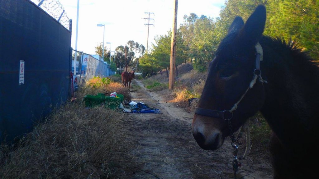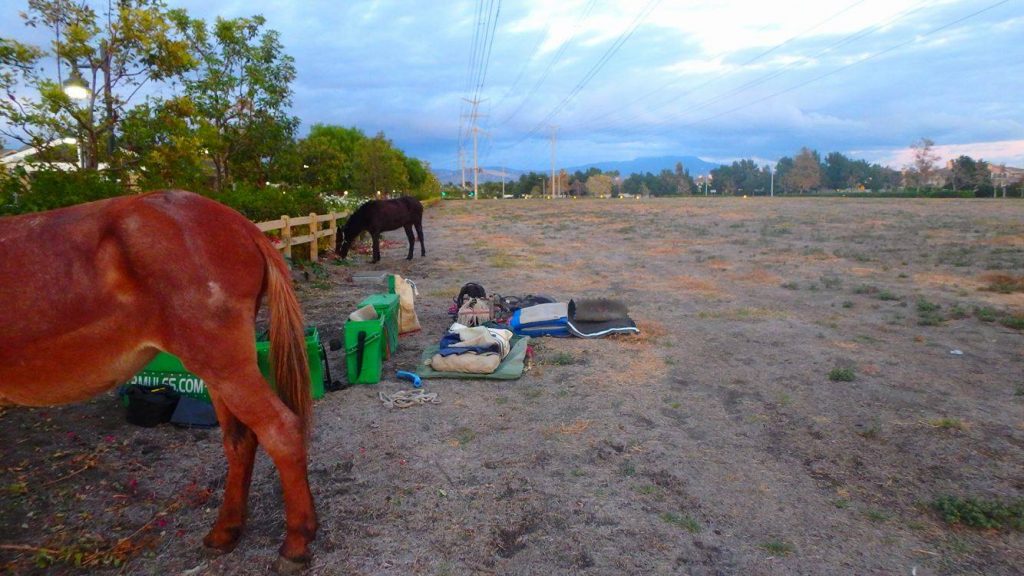 Paramount, CA – November 17, 2015 Pictured is where we stopped yesterday afternoon at 4:30pm in the City of Paramount. After securing the kids to some trees and removing their packs, we prepared dinner. Upon completing our meal, it became dark so we put the kids on picket lines and stayed the night. Getting up in the morning, we fixed breakfast, ate, packed up the kids who were ready and rested for a new day to spread the seeds of magic and mystery that the Mules carry.