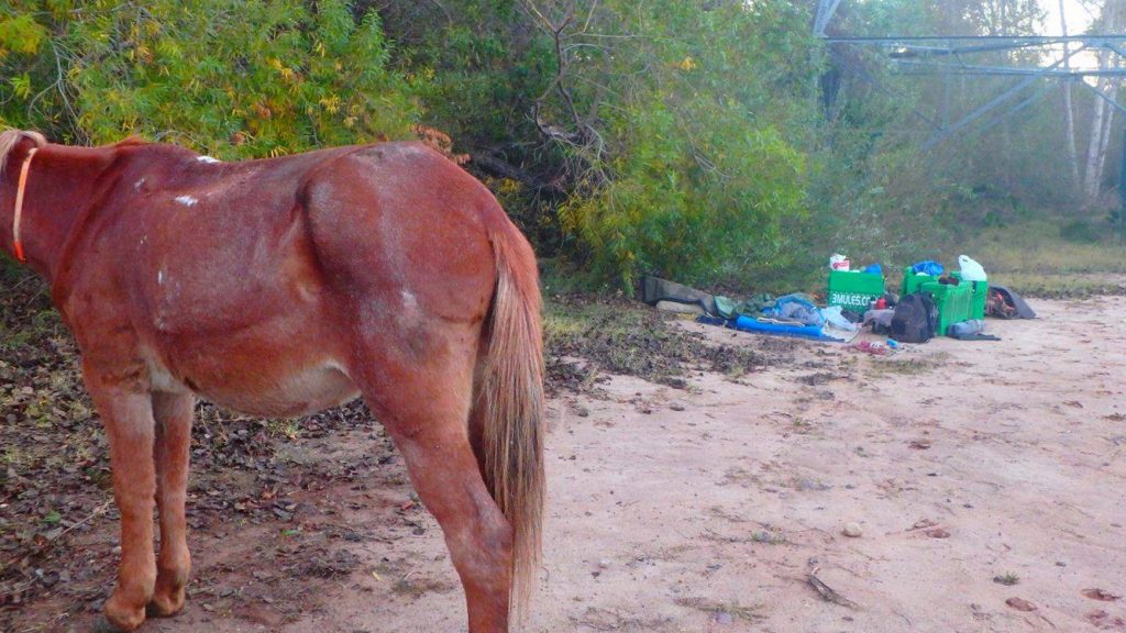 Karen asked us where we were going to spend the night. We said we didn’t know. She said we could stay the night in her backyard. We said the Mules would tear it up if it was landscaped. She said her neighbor Debbie had eight acres and she would ask her. Debbie said yes, so the Mules walked a couple of miles to Debbie’s house and spent the night.