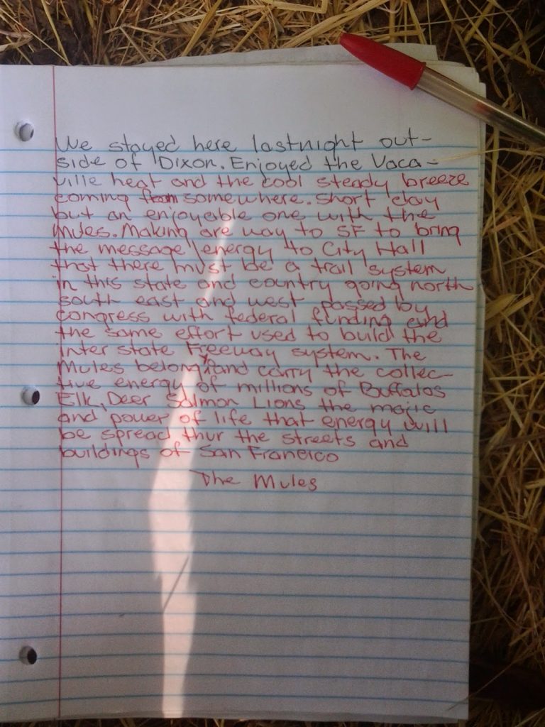 On April 14 as we were along 99 heading on our way to Sacramento and south of McFarland, Who-dee-doo decided that he was going to roll onto his back. He rolled right on top of the pack saddle, which was on him, and broke it in half. At that point, I was stranded and couldn’t go anywhere since I need a packsaddle to put my pack boxes with supplies on it. We posted on our 3 Mules Facebook page to see if anybody could bring a packsaddle to help us out.
