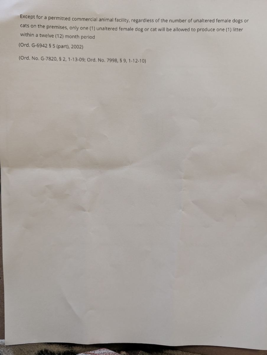 We said that it doesn’t apply to us since the ordinance applies to an animal that is sick or in extreme weather conditions. We also told him that before a complaint is acted upon, it should be investigated, and there was no investigation.