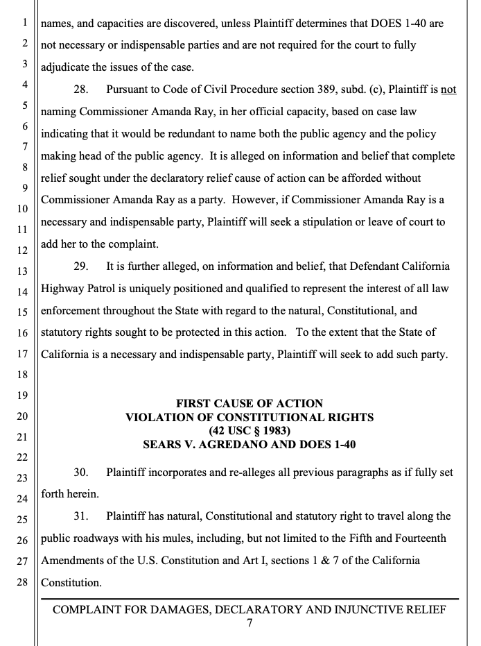 Sears filed a complaint alleging violation of his civil rights under Federal and California law, false arrest, and declaratory and injunctive relief.  In addition, to his damages, he seeks a declaration of his rights that he can present to law enforcement in the future, and for the CHP to issue a training bulletin informing officers of the right for equines and other animals to use the public thoroughfare.